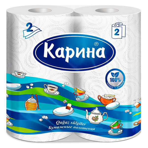 Бумажные полотенца "Карина" - 2х-слойные, белые, с тиснением и перфорацией, на втулке, влагопрочные с большой впитывающей способностью. Состав: 100% целлюлоза. Размер: 21,5 х 10,5 см. Намотка: 12 м. В упаковке: 2 рулона.