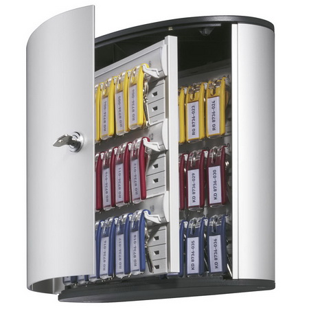Шкафчик Durable на 36 ключей. На внутренней дверце ящика расположен реестр всех хранящихся ключей. Расстояние между планками внутри ящика для ключей регулируется, в зависимости от длины используемых ключей. Размер: 302 х 280 х 118 мм. В комплекте 6 брелоков. Закрывается на ключ (в комплекте 2 ключа). Цвет: серебристый.